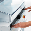 La tapa de seguridad con bisagra tiene que estar cerrada para desbloquear la palanca de corte, para el proceso de corte.
