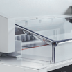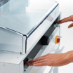 Un corte sólo puede ser ejecutado si la tapa electrónicamente asegurada y con bisagra en la mesa frontal está cerrada.